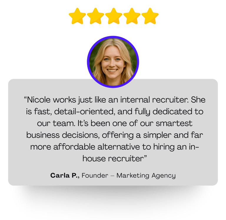 “Nicole works just like an internal recruiter. She is fast, detail-oriented, and fully dedicated to our team. It’s been one of our smartest business decisions, offering a simpler and far more affordable alternative to hiring an in-house recruiter”